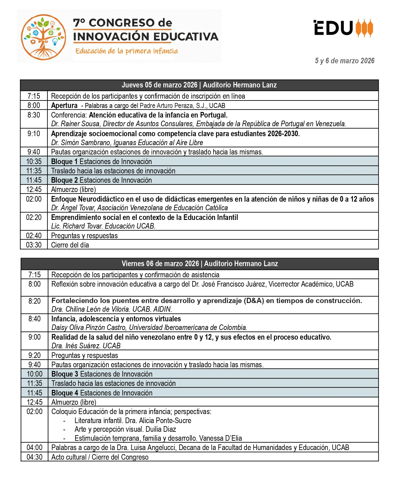 Con una mirada puesta en la preadolescencia, tendrán lugar dos charlas: el «Enfoque neurodidáctico en el uso de didácticas emergentes en la atención de niños y niñas de 0 a 12 años», a cargo de Ángel Tovar, presidente de la Asociación Venezolana de Educación Católica (AVEC), y «Realidad de la salud del niño venezolano entre 0 y 12, y sus efectos en el proceso educativo», con la docente ucabista Inés Suárez.