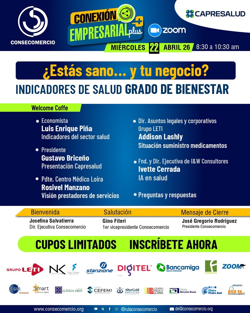 La Conexión Empresarial contará con la participación del economista Luis Enrique Piña, quien conversará sobre perspectivas del sector; Gustavo Briceño, presidente de Capresalud, presentando la nueva Cámara de Prestadores de Servicios de Salud y Sistemas Conexos; Rosivel Manzano, presidente Centro Médico Loira, desarrollará la visión de los prestadores de servicios; Addison Lashly,